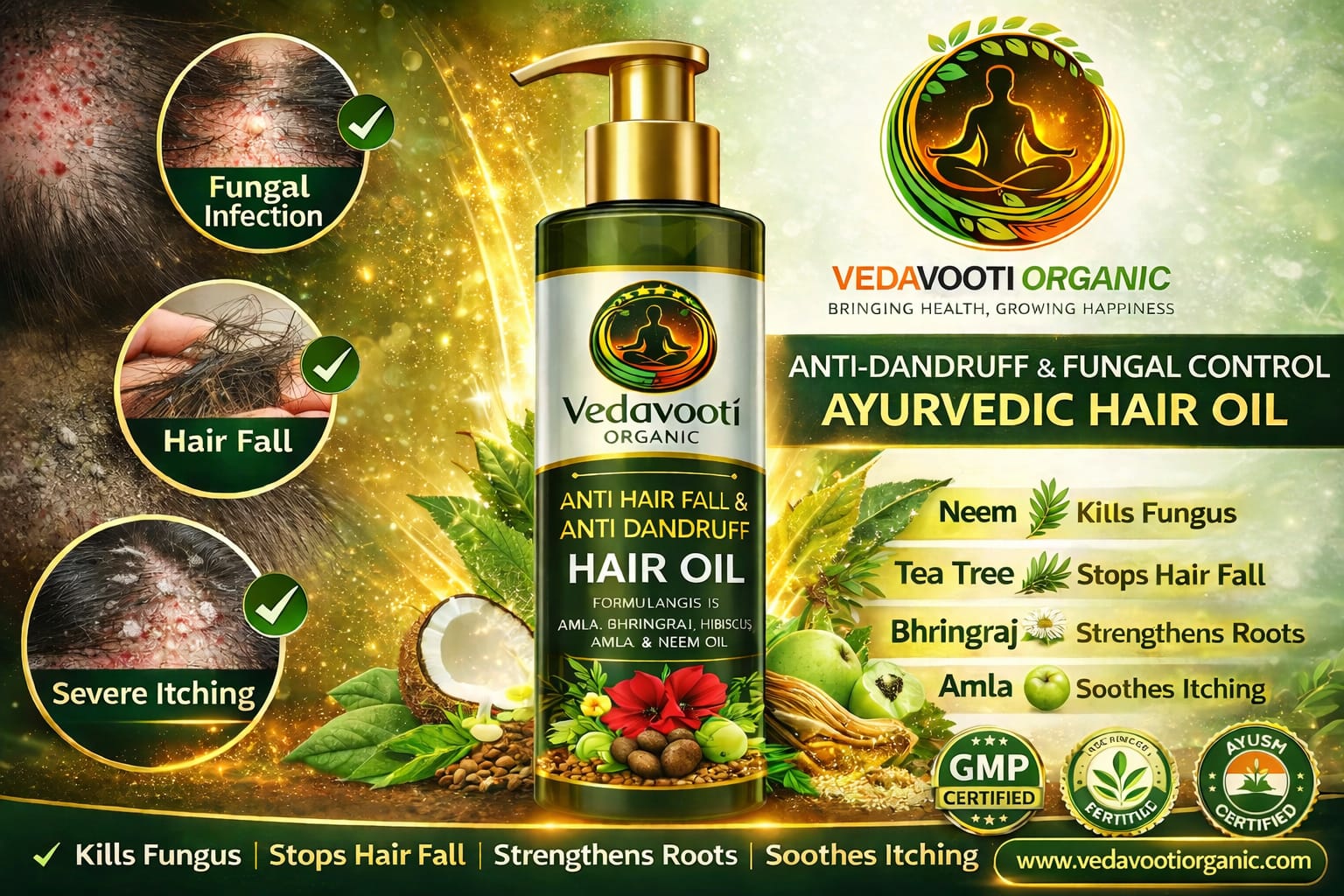 VedaVooti Organic Anti-Fungal & Anti-Hair Fall Hair Oil is a powerful Ayurvedic formulation made with 100% natural and organic ingredients to fight scalp infections, control hair fall, and promote healthy hair growth from the roots.